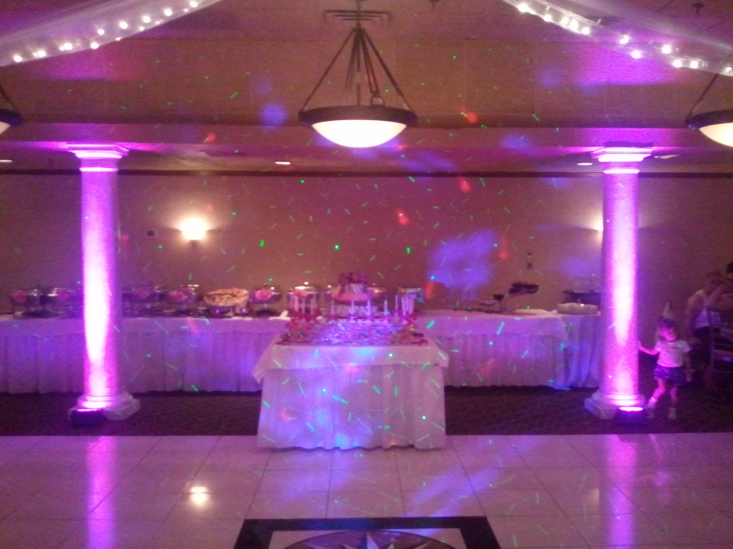 With Additional Services that we offer, you can enhance your experience at your event with numerous options. One of the most affordable and custom touch enhancements is our Custom Monogram light, where our Guest of Honors name can be displayed with or without custom images on a wall, or rotating all evening on the dancefloor. Upgraded light packages, uplighting, Karaoke, Audio/Visual rentals for slideshows and our most popular addon, the Photobooth, are also always available to take your event to the next level!